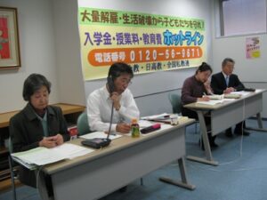 相談内容は、大企業による非正規労働者の雇い止めなどによる雇用状況の悪化や賃下げによって収入が激減していることや、不況の影響を受けて中小企業や自営業の経営が深刻なまでに悪化していることなど、保護者の生活破壊がすすみ、子どもの就修学に深刻な影響を及ぼしている実態が浮き彫りになりました。