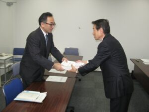 要請には、北村書記長をはじめ今谷教文局長、蟹沢生権局長、中村中央執行委員が参加。文科省は高橋道和財務課長が対応しました。