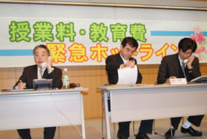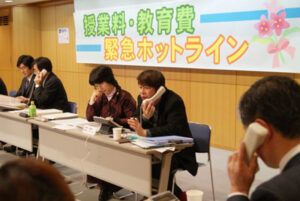 全教、日高教、全国私教連、子ども全国センターは2月11日、社会福祉・教育関係団体などの協力をえて、授業料・教育費にかかわる相談に応じるため、「緊急ホットライン」を開設しました。午前10時に始まった電話相談では、用意された6台の電話に次々と相談が寄せられ、この日午後7時までの相談は156件に達しました。