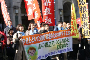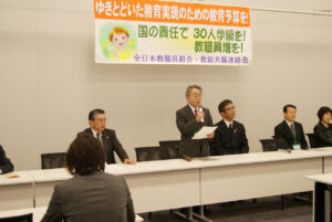 全労連・春闘共闘などは11月18日、「なくせ貧困、守ろう暮らし」をかかげて中央行動を実施しました。この日、全教・教組共闘は、教育全国署名の請願項目の実現をめざし、衆参国会議員への要請を実施しました。