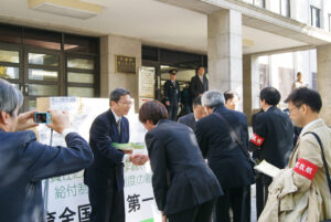 衆議院議員面会所前でおこなわれた提出行動には、近県の教職員を中心に約30人が参加。民主党・皆吉稲生衆議院議員、共産党・井上哲士参議院議員、紙智子参議院議員、山下芳生参議院議員、吉井英勝衆議院議員から連帯のあいさつをうけ、全国から集められた署名544,453筆を提出しました。また、提出行動には所用により参加いただけませんでしたが、11月24日現在、民主党11名、社民党3名、国民新党1名、共産党15名、無所属1名の合計31名が紹介議員となっていただいています。