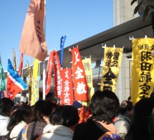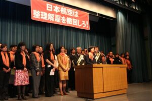 今回の整理解雇は、労働法上も確立されている「整理解雇4要件」をみたさない大企業の横暴そのものであるとともに、労働者の働く権利の一方的な蹂躙、さらには公共交通機関として最も大事にされるべき安全運航の基盤を危うくするものです。全教は、JALが今回おこなった整理解雇を、すべての労働者と国民の安全に対してかけられた攻撃ととらえています。そのため、全教はJALの不当な整理解雇撤回をもとめて、裁判に立ち上がった146名の原告団を支える「日本航空の不当解雇撤回をめざす国民支援共闘会議」に参加して、署名や宣伝行動などのとりくみをすすめています。