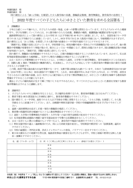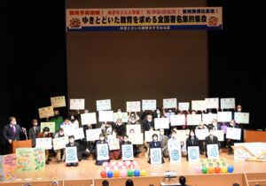 「ゆきとどいた教育をすすめる会」は12月9日、東京都内で、2022年度教育全国署名集約集会を開催しました。「教育予算を大幅に増やして、20人学級を展望した少人数学級の前進、教育無償化を実現させよう」など要求をかかげ、この日までに集約した署名数は昨年度を上回り245万3604筆となりました。特別報告では教員から「教員不足をはじめ、いまだに教室にエアコンが付いていない実態をあげ県民葬より教育予算を」保護者からは「将来に不安を持たせる、高学費やこの社会を変えていきたい」愛知の高校生からは「私学助成を拡充されたが、無償化の対象から外れる生徒がいる、だれもが安心して学べることを当たり前に」、東京の高校生からは「東京23区で宣伝を行い、23区プロジェクを通して私学助成の存在を広げていきたい」と報告がありました。最後にアピールを採択して、この力をさらに大きくして、2月の提出行動に向け、とりくみをさらにすすめることを確認して集会を終えました。