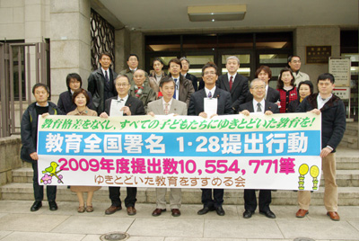 ゆきとどいた教育をすすめる会は1月28日、教育全国署名の提出行動を実施し、1055万4771筆を集約したと発表しました。 行動には全教、日高教、全国私教連本部のほか、首都圏の教職員組合の代表、大阪、…