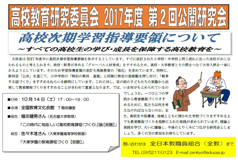 高校次期学習指導要領について~すべての高校生の学び・成長を保障する高校教育を~■日時:10月14日(土)17:00~19:00■会場:全国教育文化会館 7F会議室■報告者:植田健男さん(名古屋大学教授…