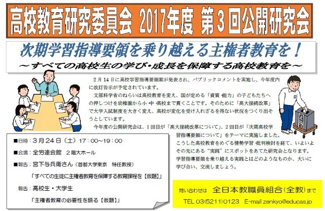 改訂学習指導要領を乗り越える主権者教育を!~すべての高校生の学び・成長を保障する高校教育を~■日時:3月30日(土)17:00~19:30(予定)■会場:全国教育文化会館 1階全教共済会議室■報告:宮…