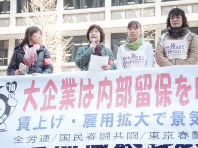 全労連・国民春闘共闘・東京春闘共闘は1月19日、2010年春闘の闘争宣言行動を実施し、2010年春闘を本格的にスタートさせようとのアピールをおこないました。写真:全教を代表して決意表明をおこなう本田…