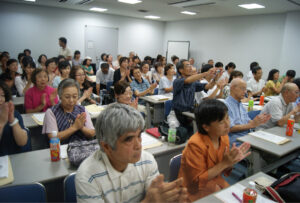 引き続いて場所を異動して行われた報告集会は、会場に入りきれないほどの人々で埋まり、8年以上にわたってたたかってきた原告と、裁判を支えてきた10数人の弁護士一人ひとりからの報告が行われました。判決文を十分検討できていない段階とは言え、現在の司法の反動化の中での位置づけや、学習指導要領の裁量性の問題から考えれば、「画期的」と言っていい内容です。