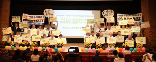 7月4日に「教育全国署名」スタート集会を開催しました。各地から公立・私立の教職員や保護者、高校生が参加し、署名運動の前進をめざして決意が語られました。