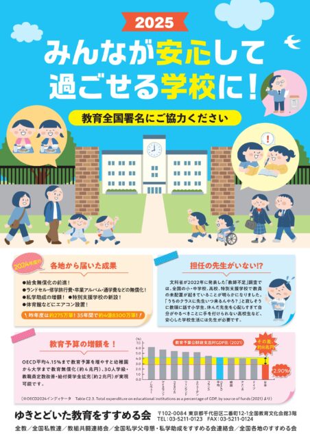 全教が参加しているゆきとどいた教育をすすめる会は、国の責任による「20人学級」を展望した少人数学級の前進、教職員定数増、教育無償化、教育条件の改善を求め、今年も2025年度ゆきとどいた教育を求める全国署名(教育全国署名)に引き続きとりくんでいます。