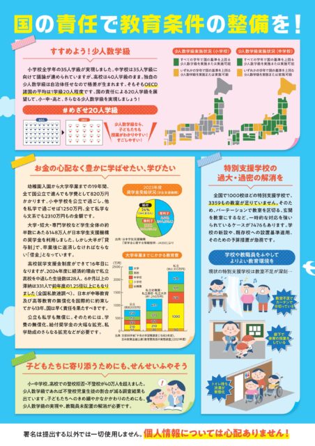 ポスターやチラシを活用しながら、全国各地で教育全国署名を広げ、教育予算増を目指し、みんなが安心して過ごせる学校にしていきましょう。