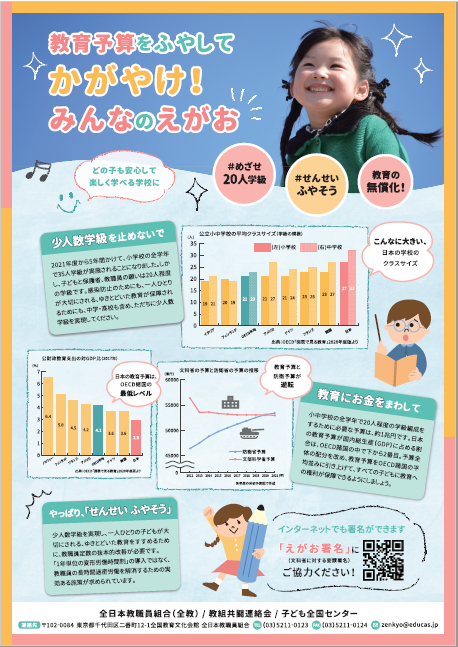 コロナ禍のもとでのねばり強い運動により、子どもと保護者、教職員の切実な願いであった少人数学級が、ようやく前進することになりました。しかし2021年度の文科省予算案では、小学校2年生での35人学級実施を見込んだ上でも尚、児童生徒数の自然減などにより、教職員定数の実数と配当額が削減されています。GIGAスクール構想を推進するために莫大な予算を使う一方、ゆきとどいた教育と教職員の長時間労働解消のための「#せんせいふやそう」の声には背を向けたものとなっています。2022年度予算にむけた文科省概算要求に対する要請署名(「えがお署名」)のとりくみを通して、「ただちに20人学級実現を!」求める声を大きな世論に広げていくことが求められています。