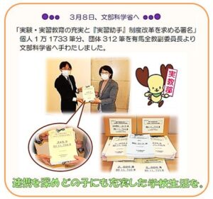 ③ 「実習助手」制度を見直し、教諭一元化にすること。そのため、学校教育法、高等学校設置基準、高校標準法など、関連諸法規の改正をおこない、職種間で起こっている矛盾をなくし、共同した学校づくり・教育活動ができるようにすること。
