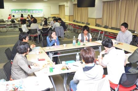 グループ討論では、それぞれの職場の実態や悩み、青年部活動をどう発展させたいかなどを交流し、お互いに共感を寄せ活発な討論が展開されました。少人数で討論をしたので、参加者がみんな発言でき、その後の交流会でも初めての方も含めてもりあがりました。