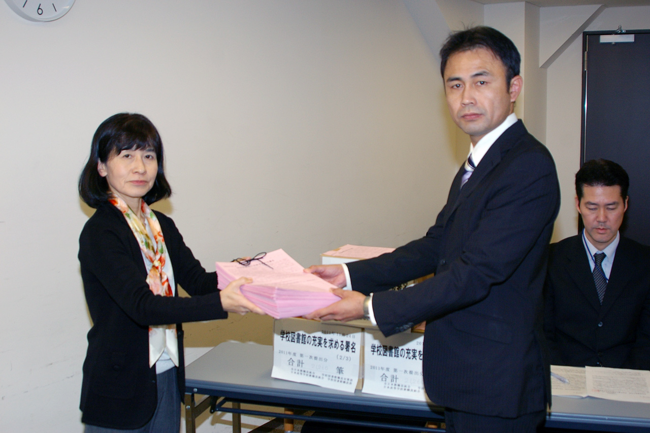 全教学校図書館職員対策部は、日高教学校司書部とともに、11月24日、学校図書館の充実を求めて、文部科学省との交渉を行いました。全教からは、磯崎副委員長、五十嵐日高教中執、川原対策部部長、山田学校司書部部長らが参加し、職場からの署名2万1260筆を第1次分として提出して、東日本大震災からの学校図書館の復旧、学校図書館費(図書費)の大幅増額、専任・専門・正規の学校司書の全校配置などを要求しました。