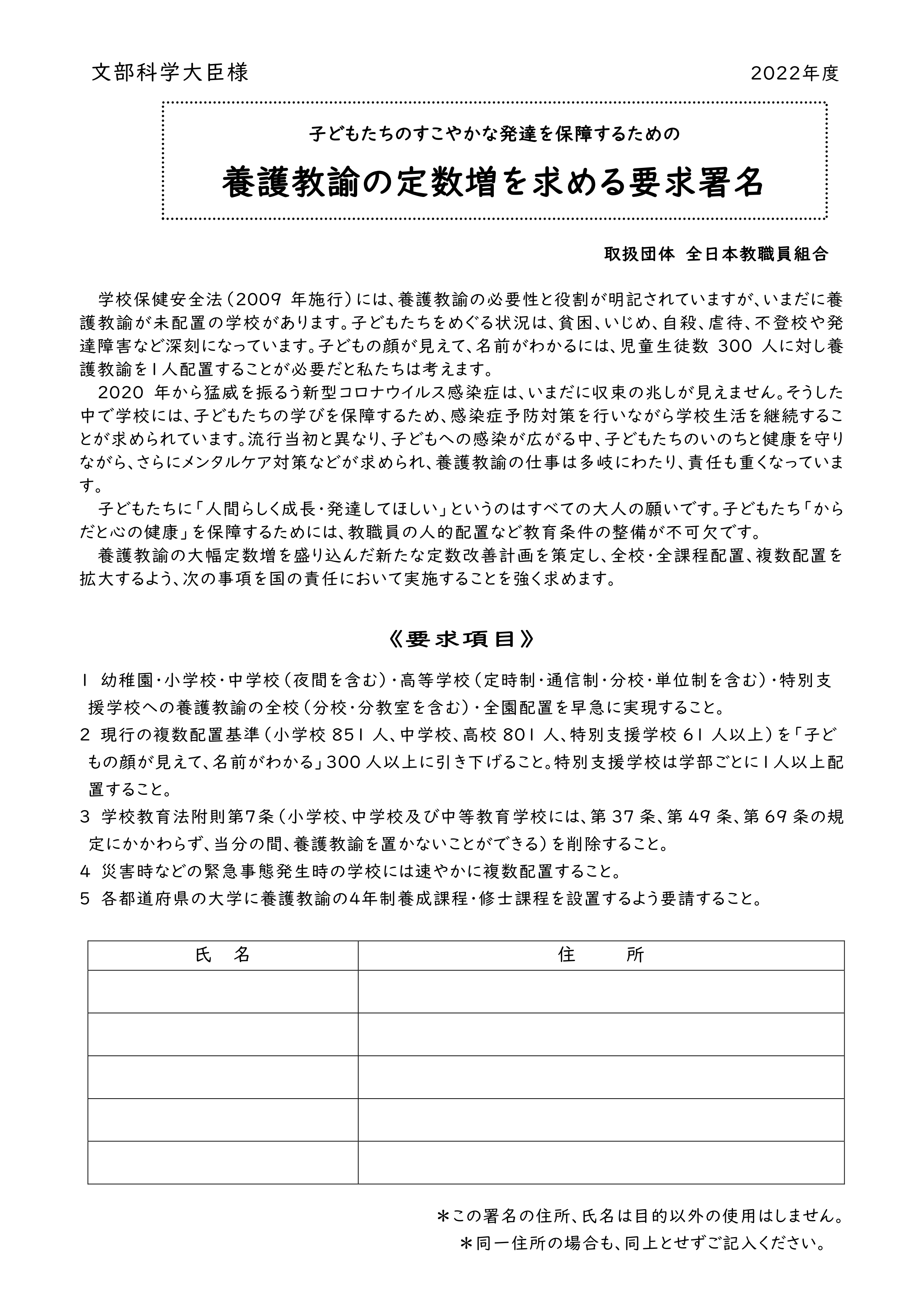 全教養護教員部は、6月12日の定期総会で、すべての学校(園・課程)への養護教諭配置と複数配置の大幅拡大を目指し、今年度も子どもたちのすこやかな発達を保障するための「養護教諭の定数増を求める要求署名」行動を行うことを決定しました。要求実現のために今年度も積極的にとりくみましょう。