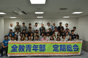 総会は板橋由太朗青年部長の「今こそ、1947教育基本法、そして日本国憲法に則った教育をすすめていきたい」という挨拶で始まりました。