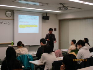 昼食交流に続き、午後は「話し合い指導の方法論~道徳を利用した学級づくり~」「学校は何のためにあるの?~進学指導、試験に追われる学校現場~」の2つの選択授業を行いました。参加した学生からは「『いじめを許さない』ではなく『いじめをみんなで解決しよう』を目指すのは大切だと思った」「対話というのは生徒の中にいるもう一人の生徒に話しかけること、すべてのものに原因がある、生徒と交流の基本に立ち返れてよかったです」などの感想がありました。何を大事にして子どもたちへ向き合っていけばよいのか、学生と一緒に深めることができました。
