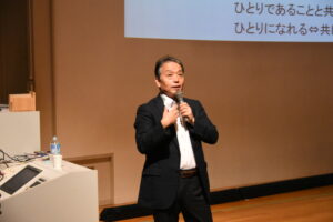 記念講演は、北九州市でホームレス支援の活動を行っているNPO法人「抱樸」理事長の奥田知志さんより、「助け・助けられることこそ教育~命の意味が問われる時代に~」と題して話していただきました。生きることの意味を問うのではなく生きることそのものに意味がある、「助けて」と言えない・言わせない自己責任論が多くの子どもたちを苦しめている、大人がまず助けを求めることから始めようと、ご自分の体験を交えながら語っていただき、笑いあり涙ありの心揺さぶられる講演となりました。