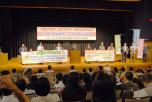社会文化会館での総決起集会(壇上で決意を表す全教の代表)