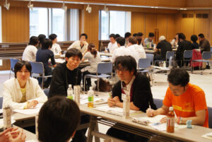 指定討論を受けて、5つのグループ(1グループ10~11名)に分かれ、議案、とりくみ、普段考えていることなど自由に交流。双方向での意見交流が参加者にも好評でした。各グループでの討論の内容は常任がとりまとめ、2日目冒頭で整理・紹介しました。